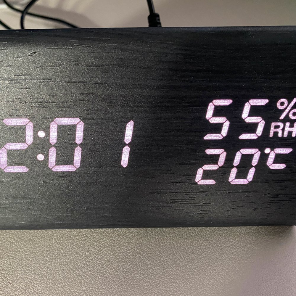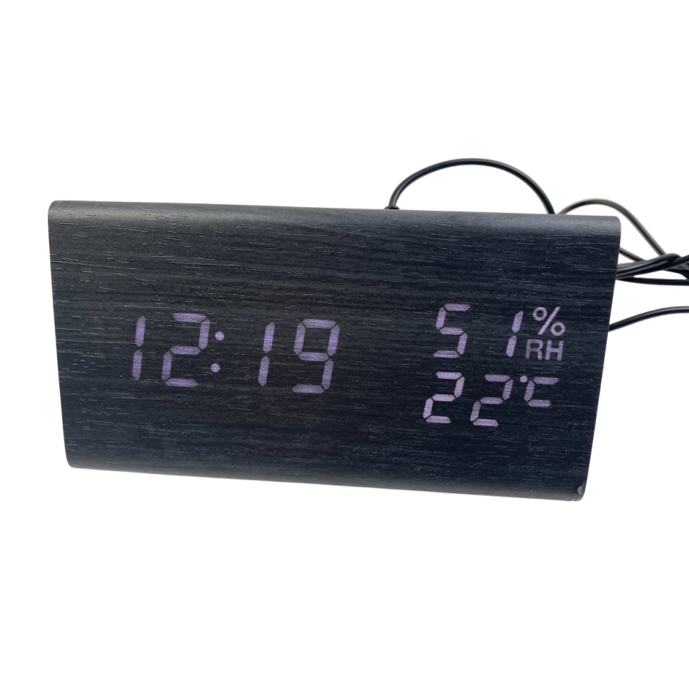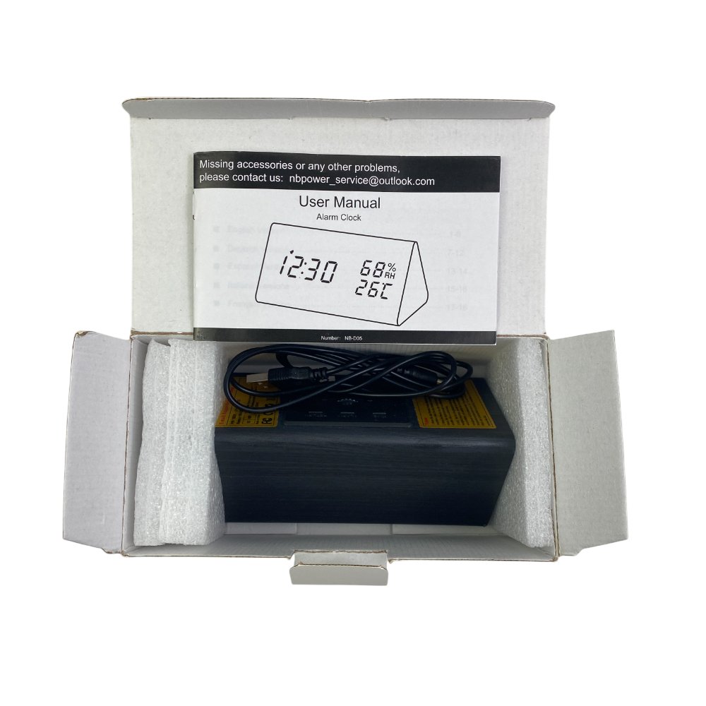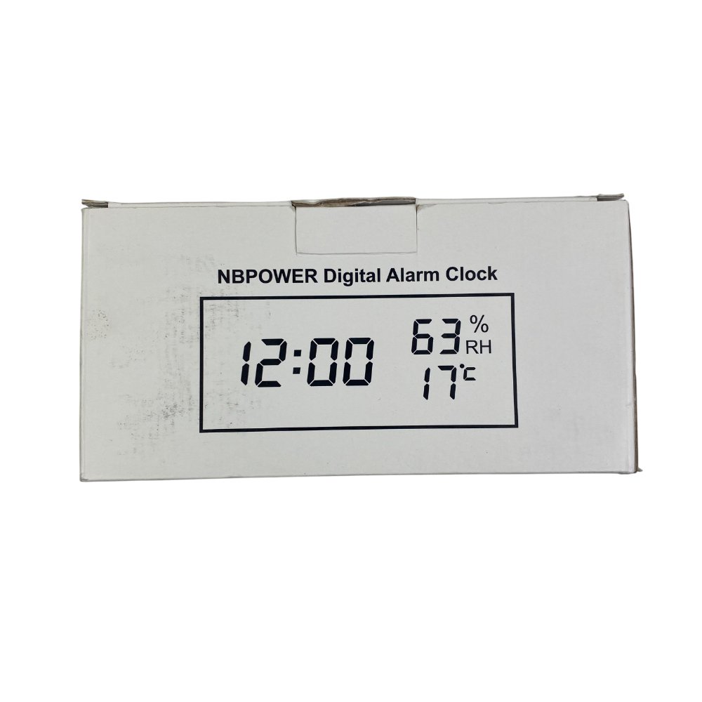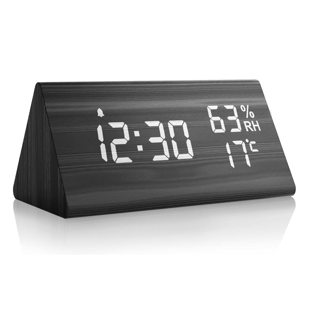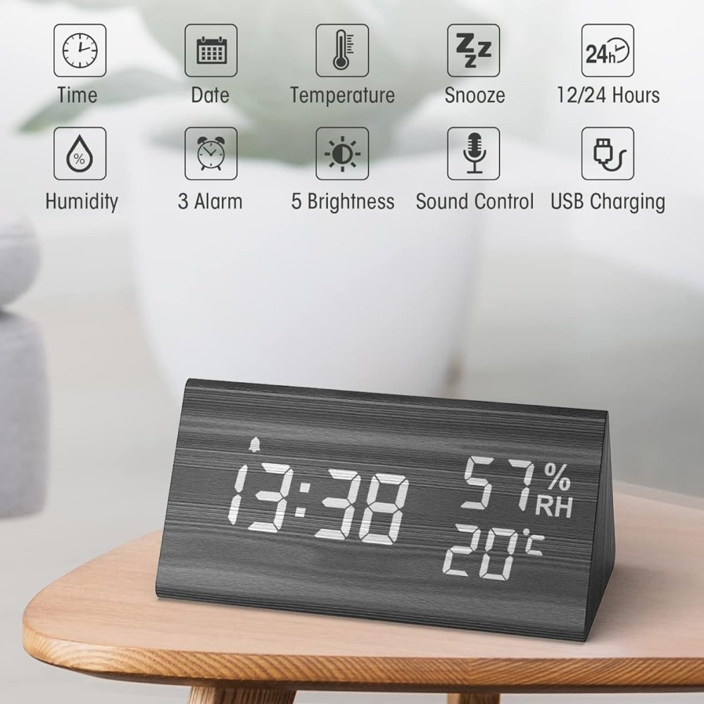 NBPOWER digitālais modinātājpulkstenis ar LED mitruma indikatoru, galda pulkstenis ar balss modinātāja ekrānu/atlikšanu/datumu/temperatūru un mitrumu, modinātājpulkstenis ar dabīga koka tekstūru.